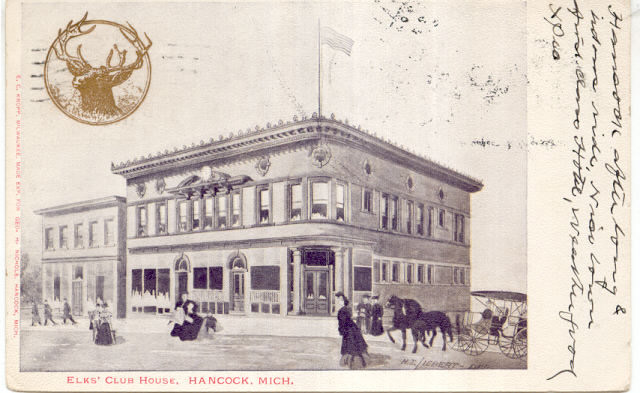 Elks Club Hancock’s Elks Club contracted for a two-story brick building with a rounded corner, elaborate cornice, and decorative molding over the second-floor windows. The basement was left unfinished, but was planned to accommodate bowling alleys or gymnasium, as well as the furnace. Commercial storefronts occupied the first floor, providing an income to the Elks. The second floor contained their lodge room with stage, as well as a library, private dining room, reception hall, billiard room, and kitchen. Oak woodwork adorned the rooms, including a 7’-high wainscot with plate rail and a beamed ceiling in the private dining room and a 3-1/2’-high wainscot and beamed ceiling in the library. The newspaper lauded the site: “The corner on which the structure will be erected is considered one of the best in the city and the fact that a magnificent building will be erected there by the ‘Best People on Earth’ is also pleasing.”16 This last quote was a reference to B.P.O.E., or the Elks’ formal name, Benevolent and Protective Order of Elks.